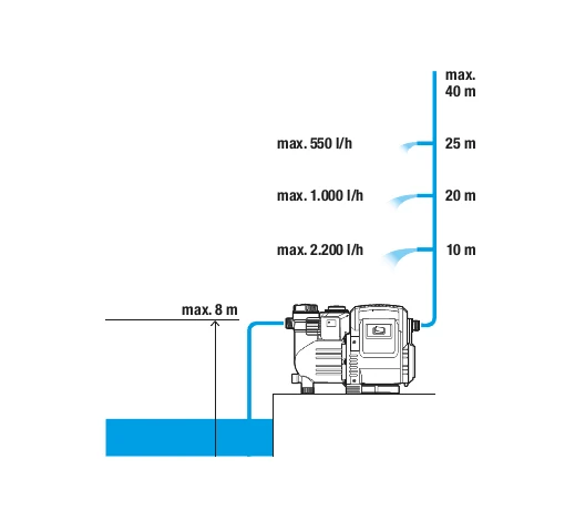 - Maximale opvoerhoogte/druk: 40 meter/4 bar