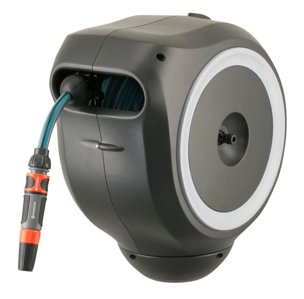 Door lichtjes aan het uiteinde van de slang te trekken, wordt de vergrendeling ontgrendeld en een ingebouwde stalen veer met innovatieve RollControl-technologie zorgt voor soepel en gecontroleerd oprollen. De RollControl beschermt de slangenbox en de omgeving tegen schade als gevolg van het te snel inrollen. Om knikken of knopen in de slang te voorkomen, heeft de box een geïntegreerde slanggeleider. Dankzij de slang- en kraanaansluitingen van het Original GARDENA System kunt u eenvoudig en flexibel een verlengstuk of ander compatibel GARDENA element op de slang aansluiten. U hebt altijd uw GARDENA slangopzetstukken bij de hand. Ze kunnen onder de muurbeugel worden bevestigd en daar worden opgeborgen om ruimte te besparen.