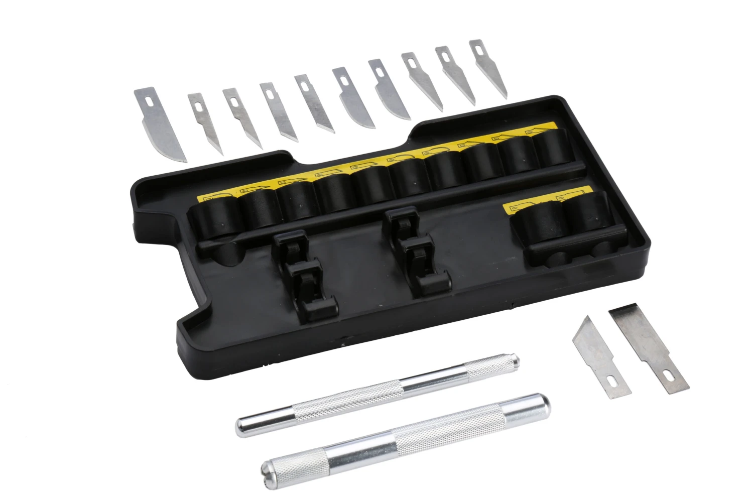 12 verschillende types bladen voor een uitgebreid aantal toepassingen zoals snijden met hoge precisie, ontbramen, inlegwerk, modelleren, sjabloneren en etsen. De mesjes worden geleverd in een handige opbergbak, die u kunt gebruiken voor nieuwe maar ook oude mesjes.