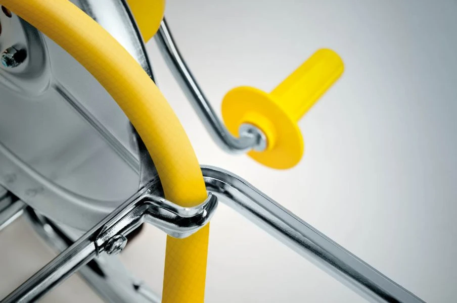 - Antiroterende messing koppeling voorkomt co-rotatie van de slangaansluiting tijdens het op- en afrollen.